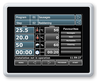 - Funciones y relés programables libremente, diversos idiomas, aire acondicionado, cocción, ahumado, horneado, pasteurización varios tipos de comportamiento
